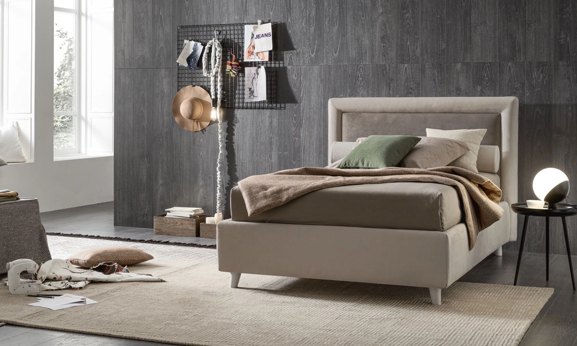 Il letto singolo Chloe in tessuto nella fotografia, tra i modelli imbottiti moderni di V&Nice, è pensato per garantire il relax totale.