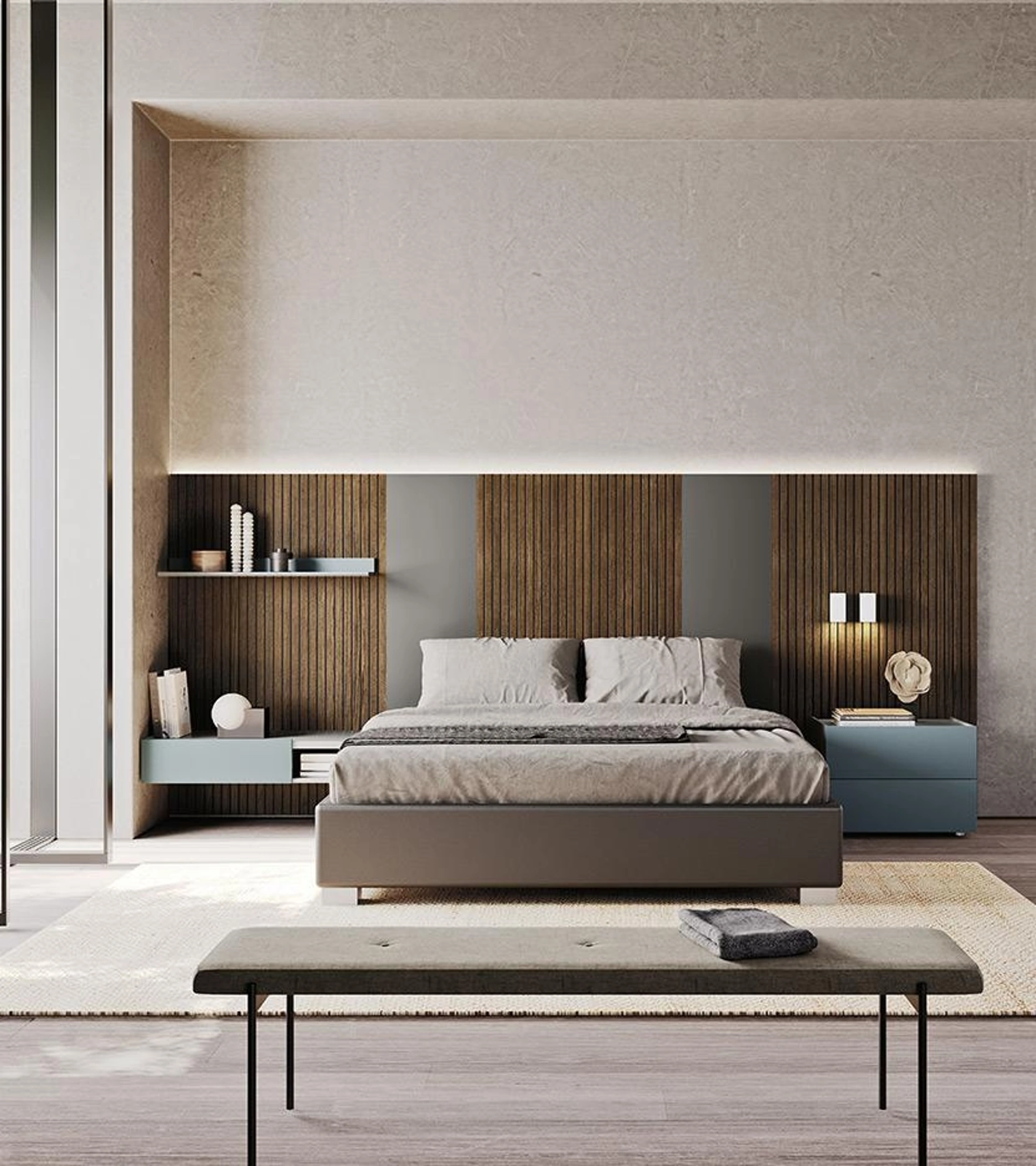 Clicca e scopri i Letti con testiera di Mobilgam! Il modello Sistema Sipario in legno ti aspetta nelle versioni matrimoniali.