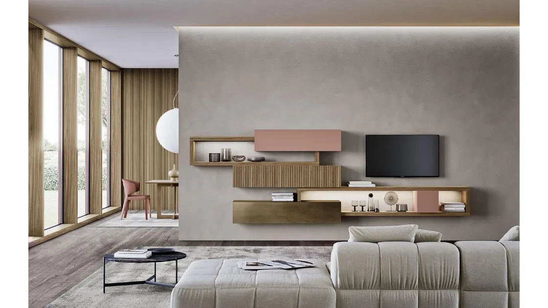 Vuoi progettare un soggiorno operativo e pratico? Ecco a te la parete attrezzata Composizione Horizon 1021 Mobilgam dalle forme decise moderne.