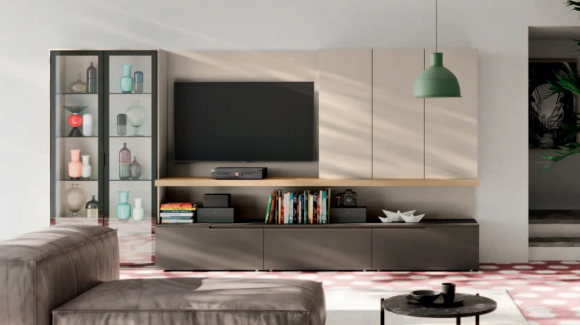 Vuoi allestire un soggiorno dinamico e operativo? Ecco a te la parete attrezzata Day 22 Orme dalle linee decise moderne.